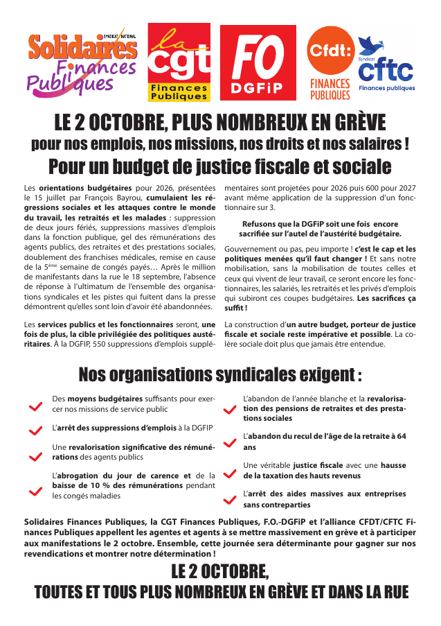 Les orientations budgétaires pour 2026, présentées le 15 juillet par François Bayrou, cumulaient les régressions sociales et les attaques contre le monde du travail, les retraités et les malades : suppression de deux jours fériés, suppressions massives d’emplois dans la fonction publique, gel des rémunérations des agents publics, des retraites et des prestations sociales, doublement des franchises médicales, remise en cause de la 5ème semaine de congés payés… Après le million de manifestants dans la rue le 18 septembre, l’absence de réponse à l’ultimatum de l’ensemble des organisations syndicales et les pistes qui fuitent dans la presse démontrent qu’elles sont loin d’avoir été abandonnées.