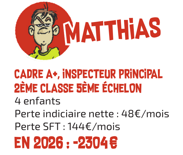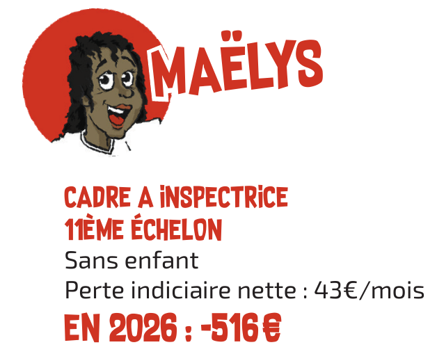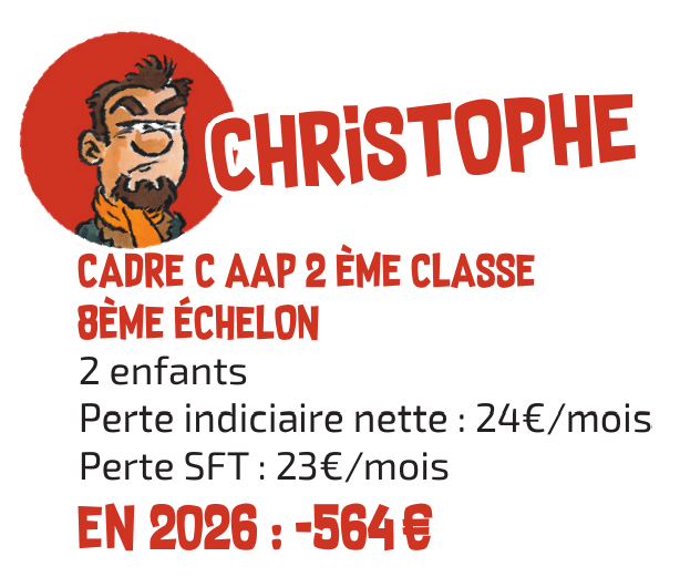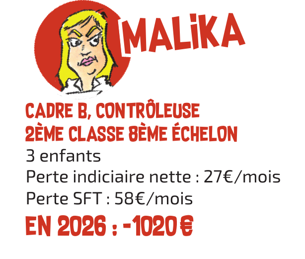 C’est sans compter les mesures passées telles que la suppression de la GIPA ou le gel du point d’indice depuis 2010 qui fait perdre actuellement à Christophe plus de 500€ par mois, ou encore la baisse de 10 % de l’indemnisation des arrêts maladie qui ont fait perdre 946€ à Malika en 2024 pour une hernie discale (trois mois d’arrêt), causée par un poste de travail qui n’était pas adapté.