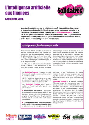 Un groupe de travail s’est tenu sur l'IA au Ministère de l'Economie et des Finances le 26 septembre 2025. Trois axes étaient au menu : la stratégie ministérielle IA, l’étude impact IA sur métiers du contrôle et la Qualité de vie - Conditions de Travail (QVCT). Solidaires Finances a alerté sur le fait que traiter ces deux (vastes) sujets IA et QVCT en 1/2 journée était impossible. Au final, le sujet de la QVCT sera abordé ultérieurement dans le cadre d’une Formation Spécialisée Ministérielle.