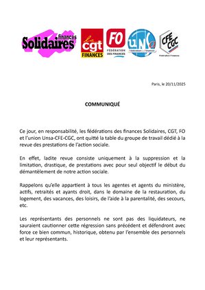 Ce jour, en responsabilité, les fédérations des finances Solidaires, CGT, FO et l’union Unsa-CFE-CGC, ont quitté la table du groupe de travail dédié à la revue des prestations de l’action sociale.